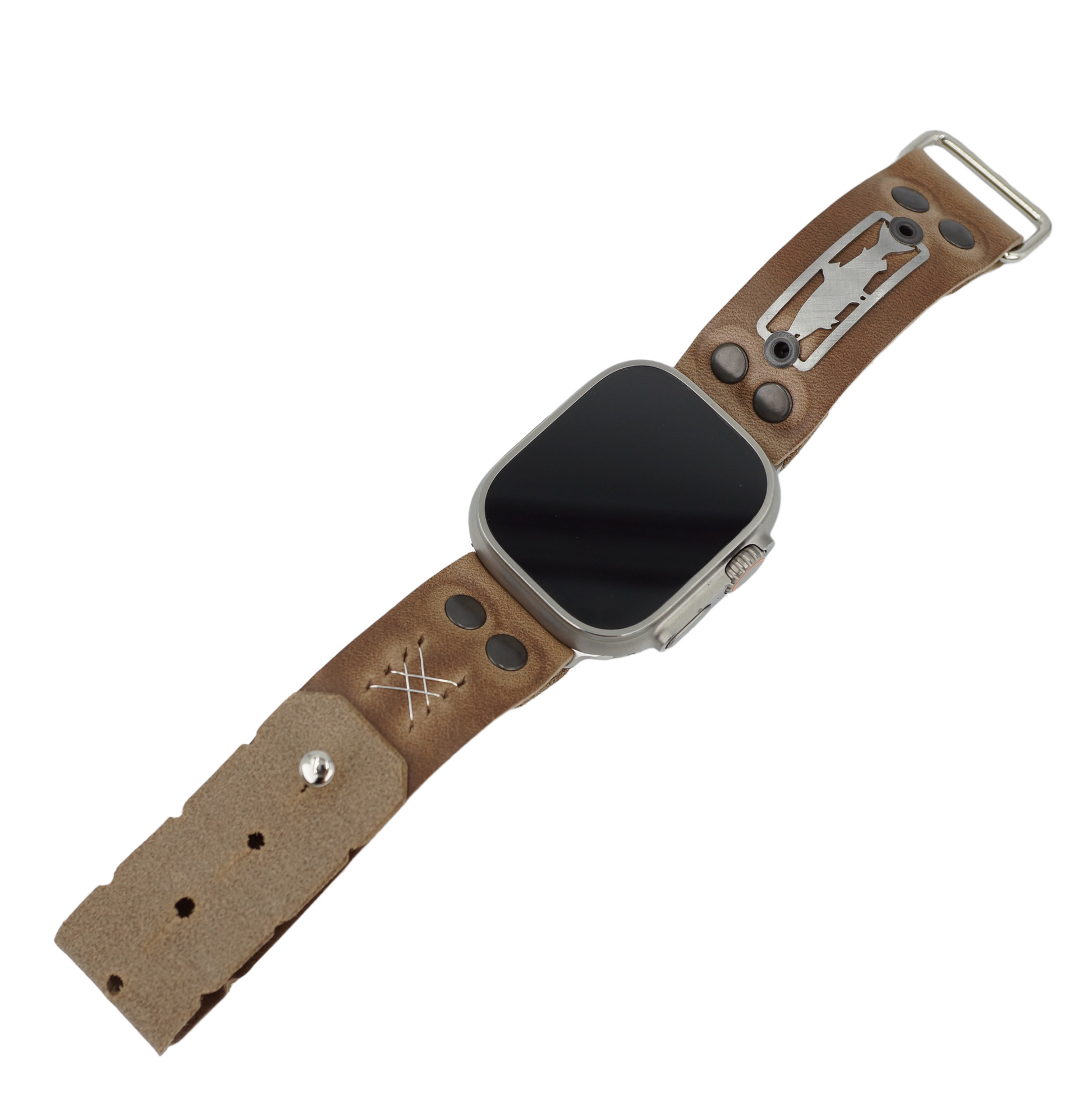Stainless steel skinny badge mounted on 1” leather watch band. Attach to your Apple Watch with a new and improved one piece metal strap connector. Fastened with ‘just right’ adjustable sizing closure to size down to 7" up to 8" wrist.