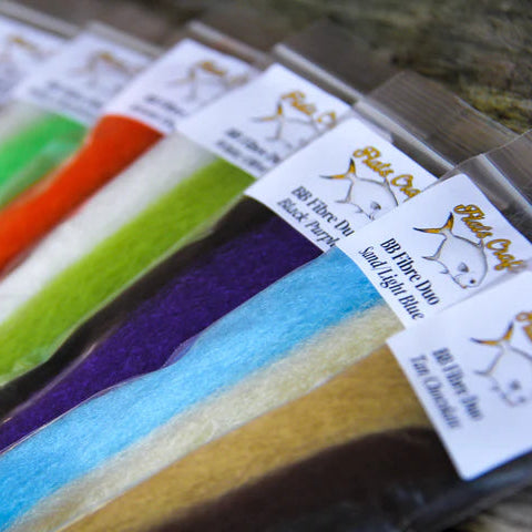 The latest fibre packs from Flats Craft. The Duo packs are 2 contrasting colours used for variegated flies such as shrimp and crab carapaces, Toad Flies or even for stacked fibre baitfish patterns. Duo is a polypropylene, meaning it’s buoyant by itself.. the same properties that make Aunt Lydia’s yarn (also polypropylene) popular on Merkin style crab flies and Toads. This doesn’t mean your fly will float, it just means it has life.