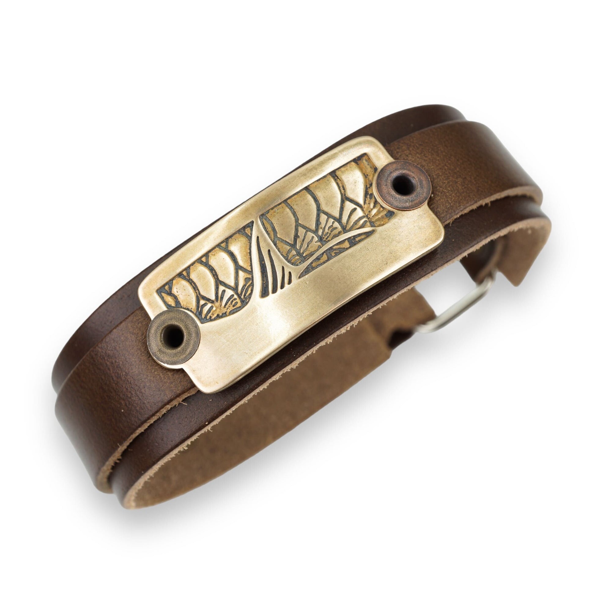 Hammered bronze badge mounted on .80” leather bracelet. Accented with leather and rivets on both sides of the badge. Fastened with ‘just right’ adjustable sizing closure to size down to 6" or up to 8" wrist. Extenders available for larger wrist sizes.