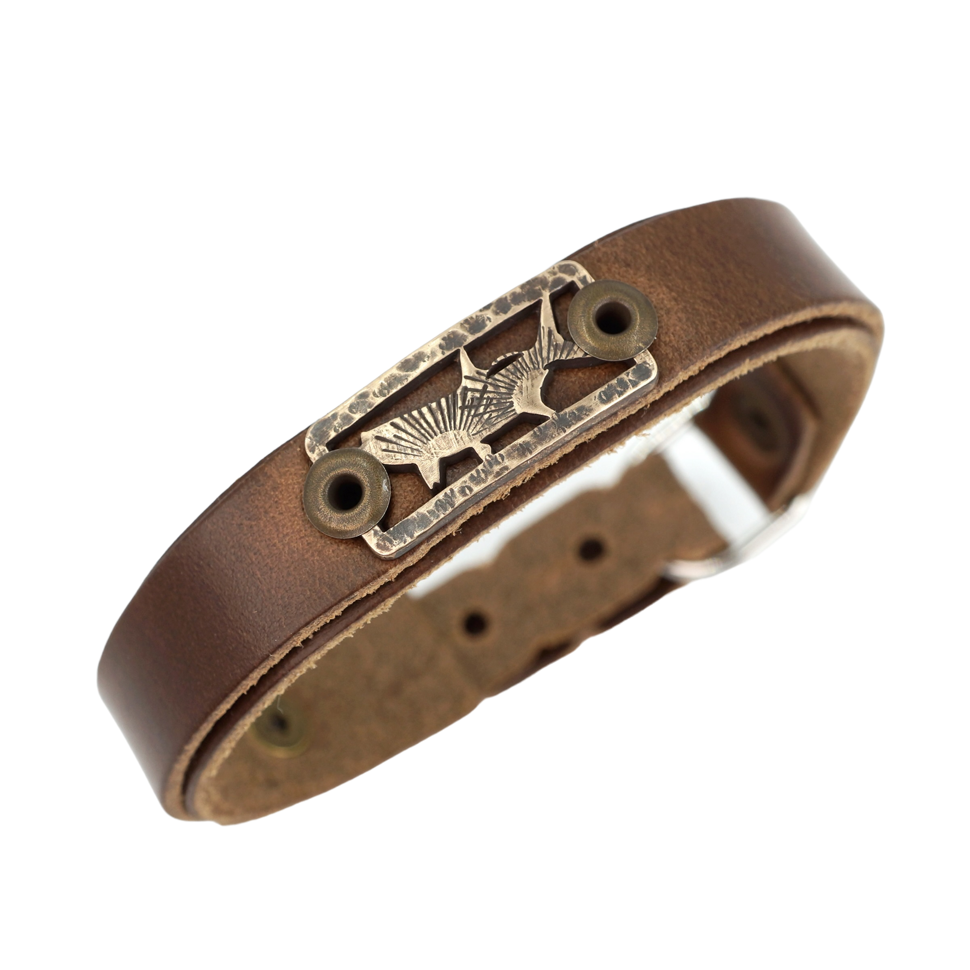 Hammered skinny bronze badge mounted on .60” leather bracelet. Fastened with ‘just right’ adjustable sizing closure to size down to 5" or up to 8.5" wrist.