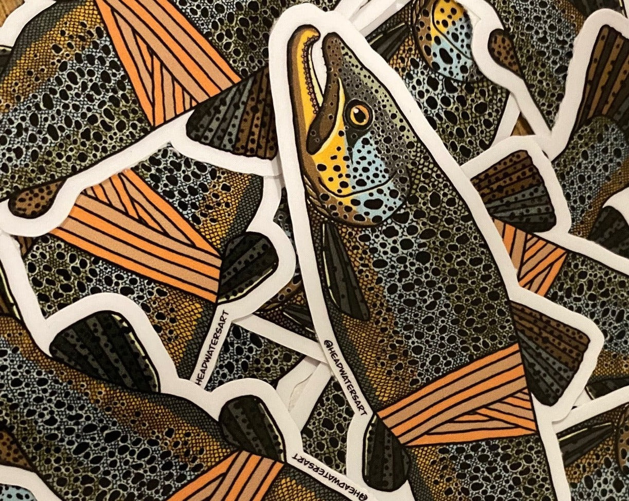 New Zealand Brown Trout artwork featuring hand-drawn art by Justin Webber. All fish measure approximately 120mm and 250mm. Premium vinyl stickers, specially laminated to resist the elements.
