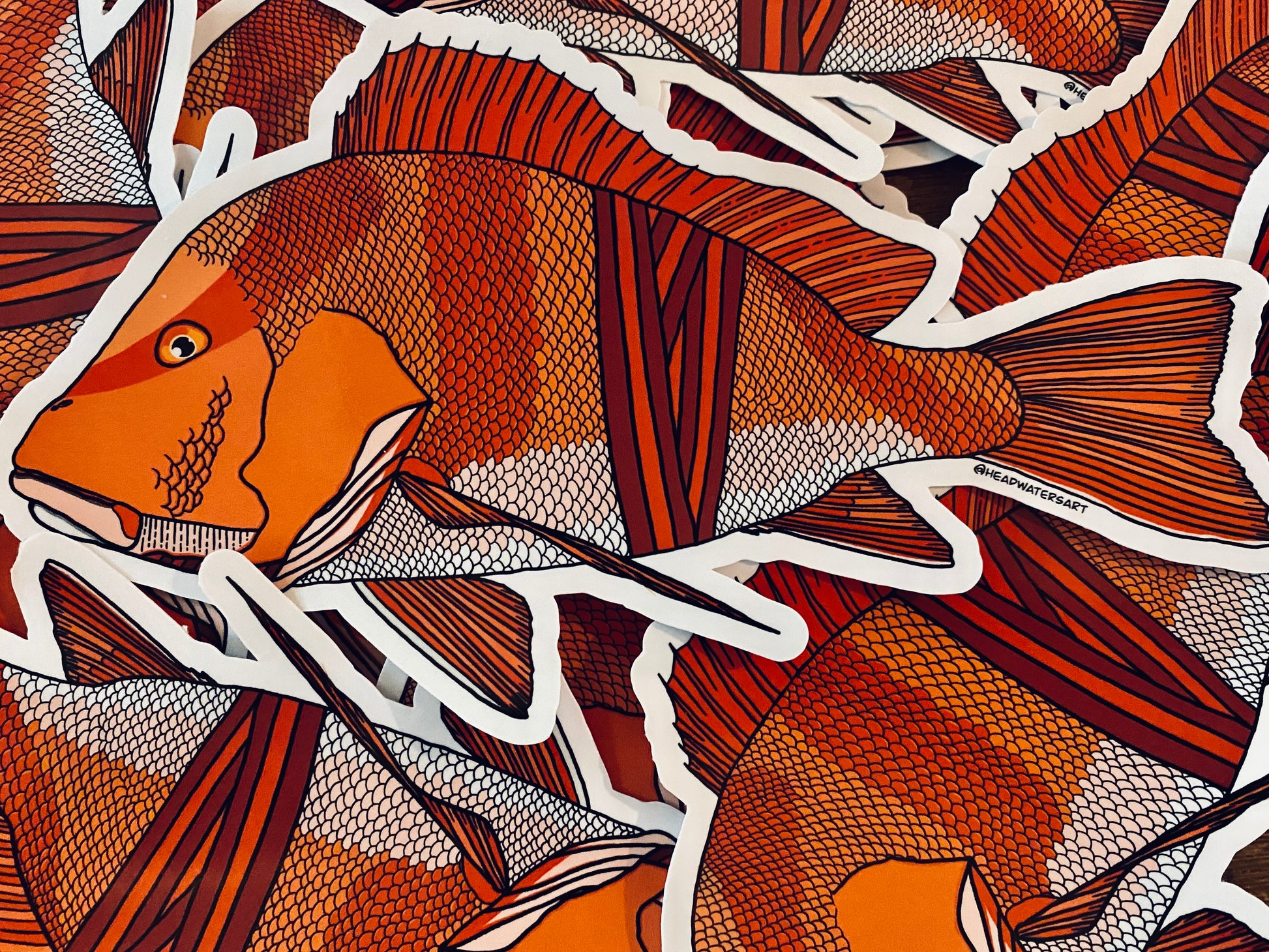 Red Emperor artwork featuring hand-drawn art by Justin Webber. All fish measure approximately 120mm and 250mm. Premium vinyl stickers, specially laminated to resist the elements.