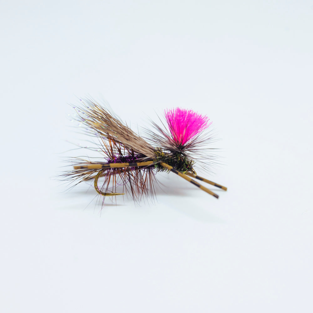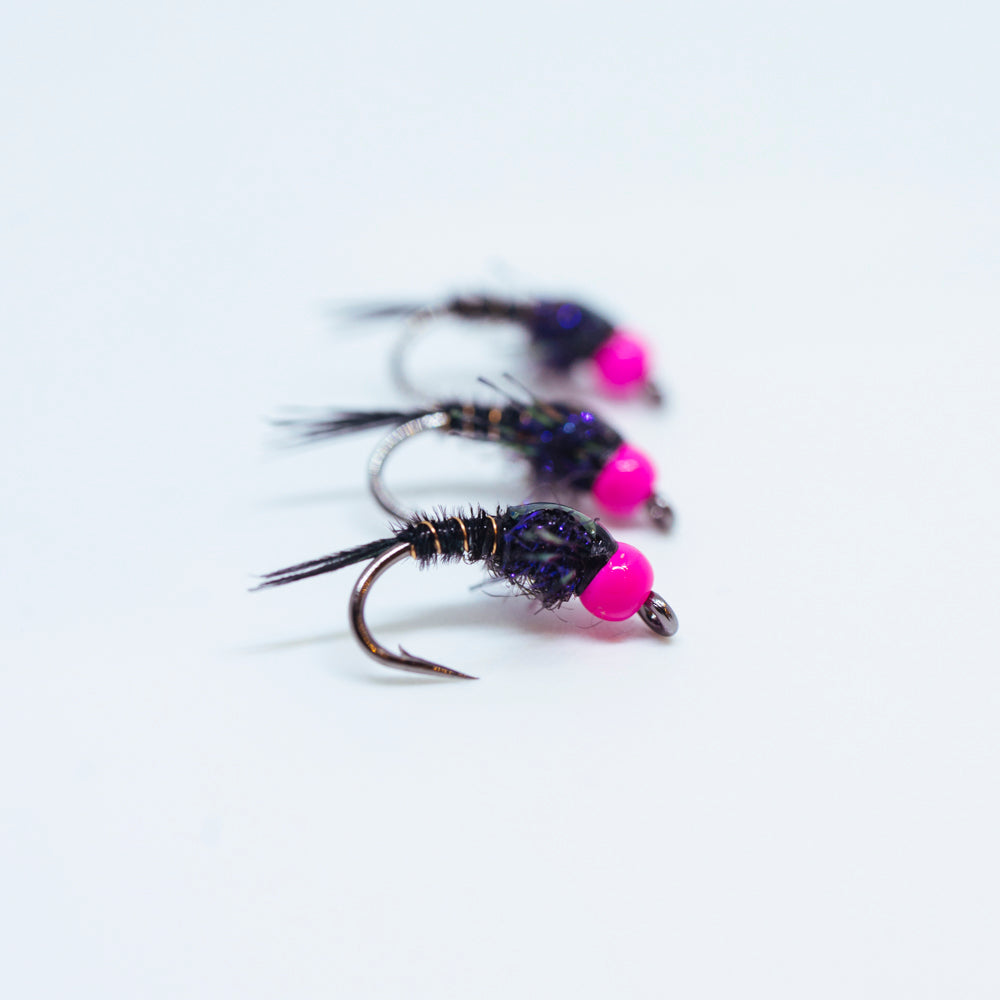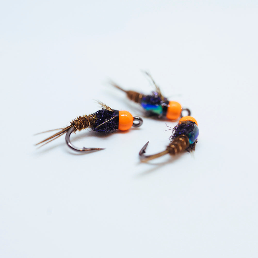 This stimulator pack includes 3 x Orange bead head brown flashback pheasant tail natural legs, 3 x Pink bead head black flashback pheasant tail flashy legs, 3 x Hi vis pmx grey and brown stimulator and 3 x Hi vis pmx claret stimulator.