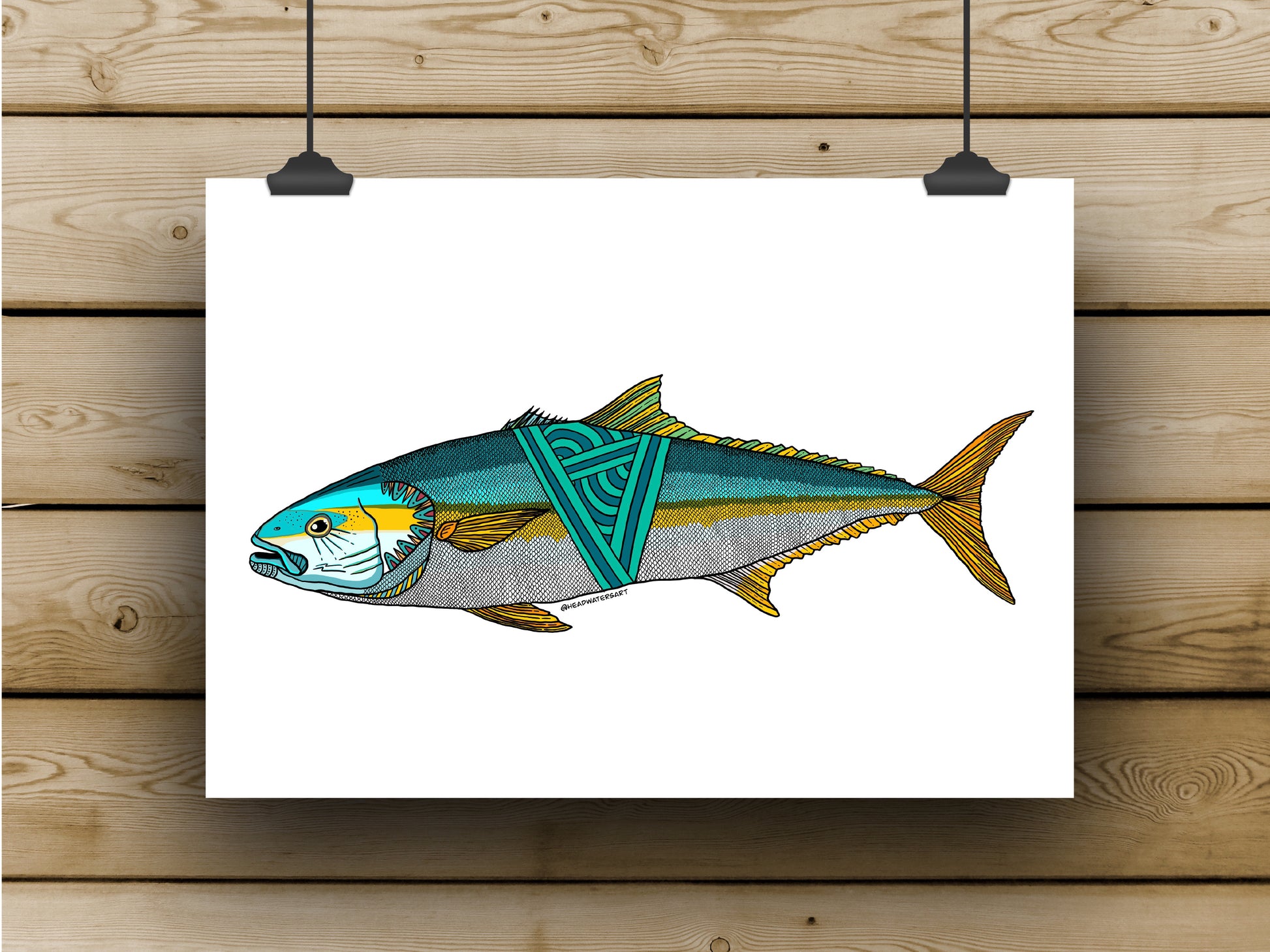 A vibrant digital Yellowtail Kingfish print on high-quality lightly textured watercolour paper.